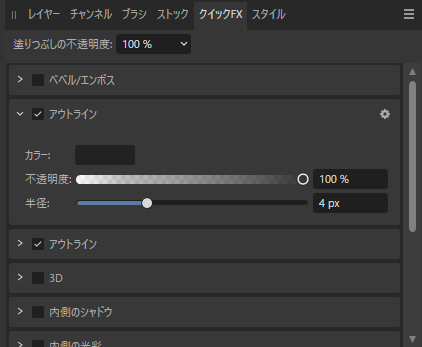 Affinity Photo 2では、ウィンドウ > エフェクト でアウトラインのパネルを表示できる(パネル名はクイックFX)