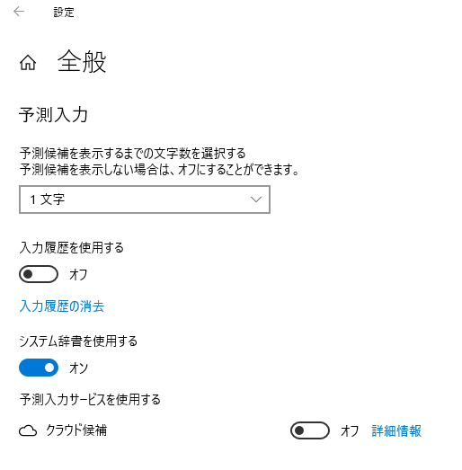 IMEの設定 > 全般 > 入力履歴を使用する:オフ