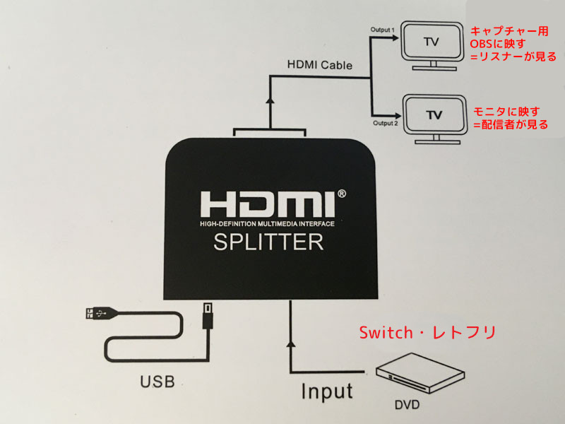 - 分配した映像の1つは自分が見るモニタに接続し、もう1つはキャプチャーボードのINPUTに接続します。