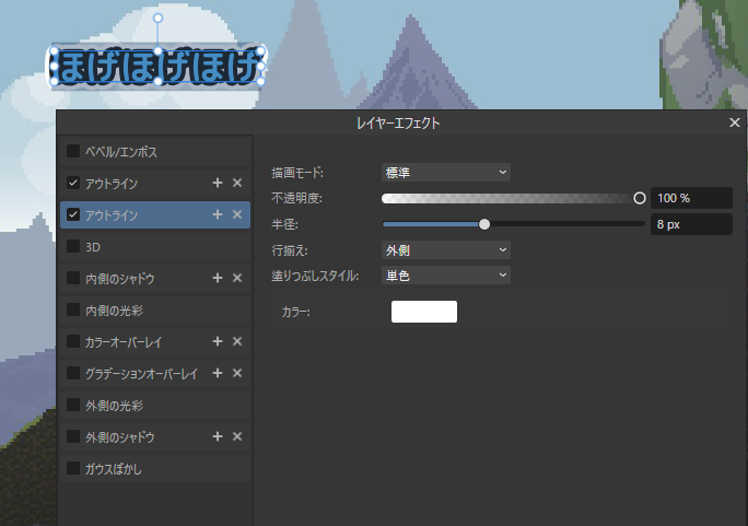 「アウトライン」を複数設定したい場合、アウトラインの右にある歯車をクリックして開いたレイヤーエフェクトウィンドウで、アウトラインの横のプラスマークを押すと複製できる。上の方にあるアウトラインが手前にくるので、下の方のアウトラインの太さを増やすと二重になる。