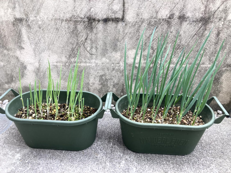 同時期に育てたものでもないですが、小ねぎで比較しました。右が生ごみ堆肥を使ったもの。窒素が多いのがいいんだとか。