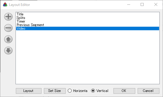 • LiveSplitを起動し、Edit Layout > Layout Editor > + > Media/VideoでVideoという項目を追加する。