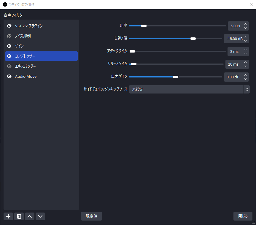 - デスクトップ音声のフィルタ > コンプレッサー 大きすぎるケースは一応対策できる(ただし配信者の耳には爆音のまま)
