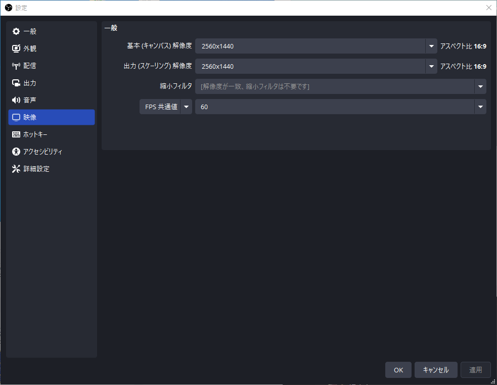 - 設定 > 映像 > 基本解像度と出力解像度を2560x1440に設定