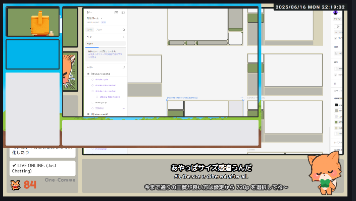 - 1920x1080からの変更で画面のレイアウトが崩れるかと思ったが、勝手にOBS側で良い感じに拡大される。