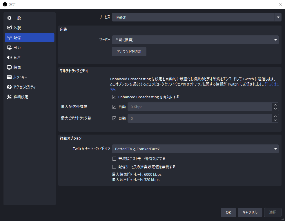 - 設定 > 配信 > 「マルチトラックビデオ」の「Enhanced Broadcasting」ボックスにチェックを入れる