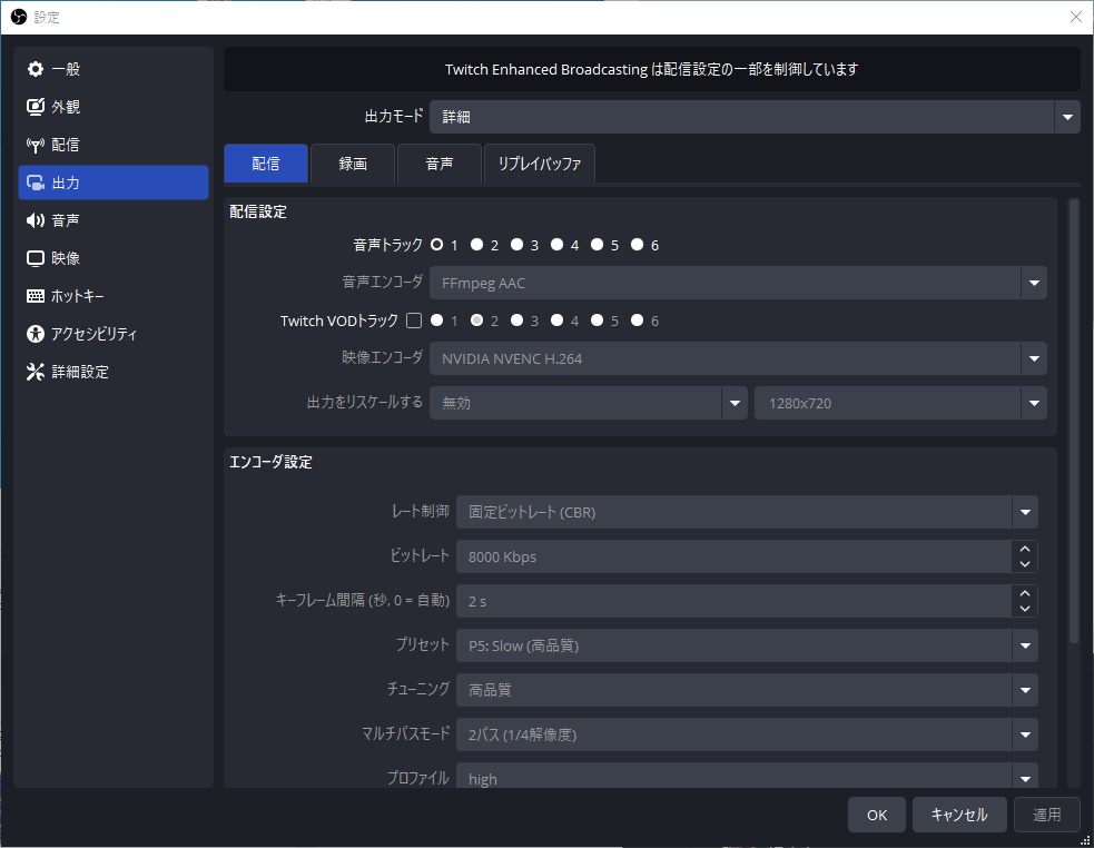 - 設定 > 出力 > 配信タブの設定は自動になるので変更できなくなる
