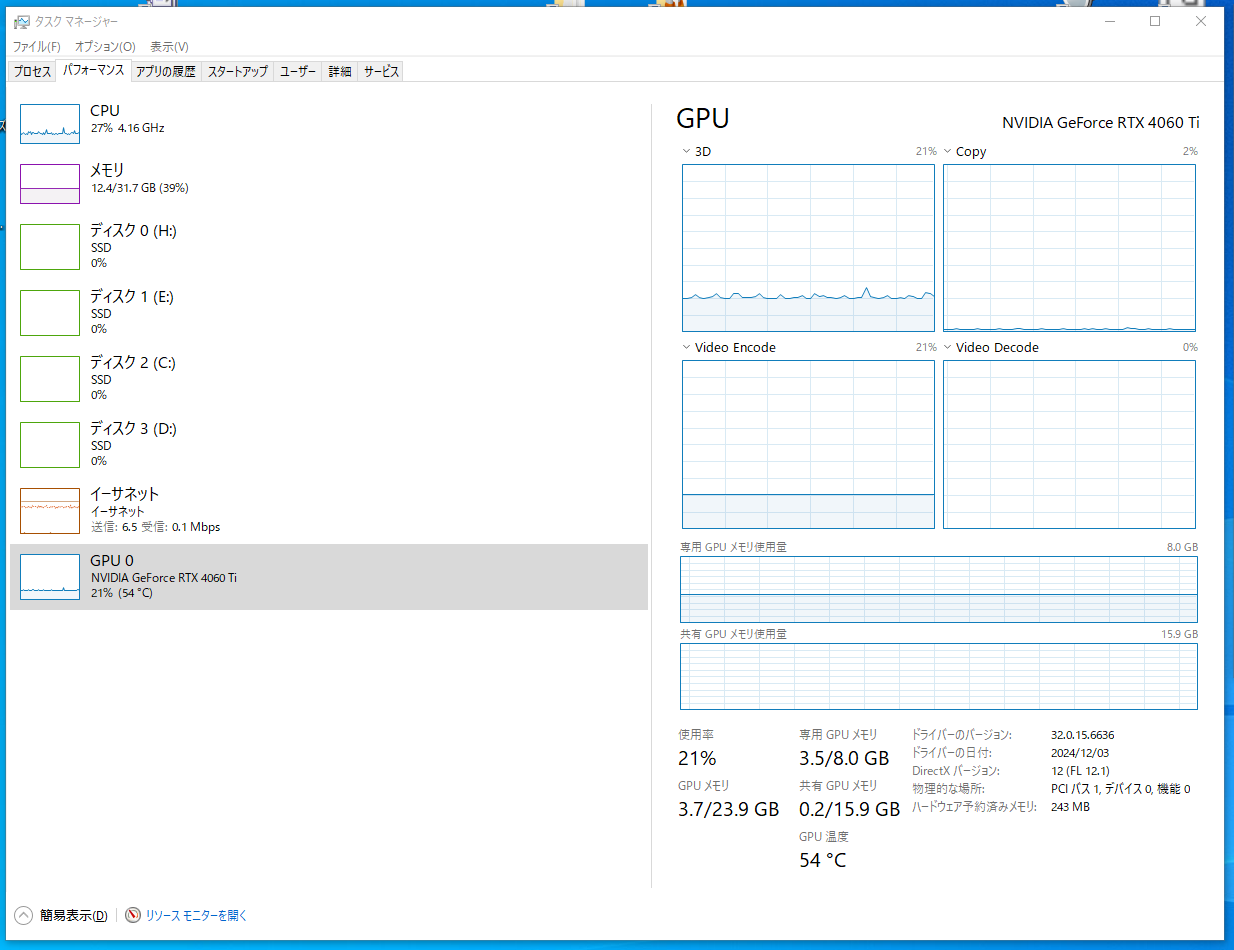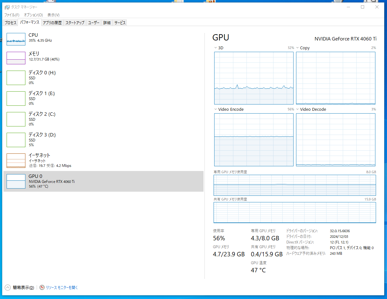 - GPU負荷は3Dが少し、VideoEncodeがそこそこ増えます。
