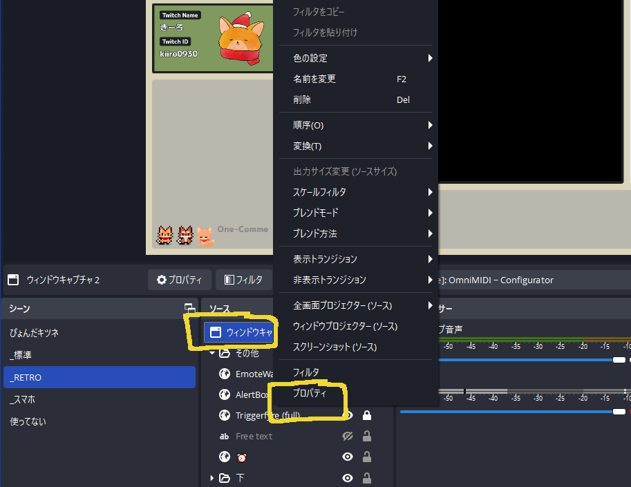 - すでに作成したウィンドウキャプチャを右クリック > プロパティ